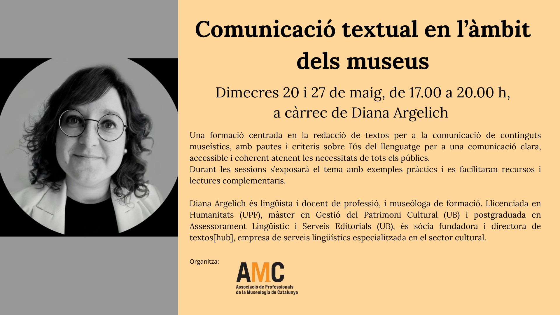 Ens plau convidar-vos al curs Comunicació textual en l’àmbit dels museus, una formació centrada en la redacció de textos per a la comunicació de continguts museístics, amb pautes i criteris sobre l’ús del llenguatge per a una comunicació clara, accessible i coherent atenent les necessitats de tots els públics. Durant les sessions s’exposarà el tema amb exemples pràctics i es facilitaran recursos i lectures complementaris. Aquesta formació és a càrrec de Diana Argelich:
