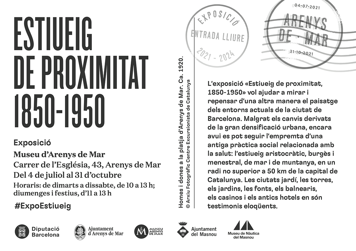 Estiueig de proximitat. 1850-1950 és una exposició itinerant, organitzada i produïda per la Diputació de Barcelona, el Museu d’Arenys de Mar i el Museu Municipal de Nàutica del Masnou, i comissariada per Joaquim Maria Puigvert, professor d’història contemporània de la Universitat de Girona. La mostra, concebuda a partir dels seus treballs de recerca en l’àmbit de la salut i l’estiueig, i de la recerca realitzada en les col·leccions dels museus de la Xarxa de Museus Locals i els fons fotogràfics de la Xarxa d’Arxius Municipals, ofereix al visitant una panoràmica del fenomen social de l’estiueig de les classes benestants a l’entorn de ciutat de Barcelona, en un radi no superior a 50 Km, durant el període que va de 1850 a 1950. Si bé l’exposició fa un retrat social dels estiuejants (com es desplaçaven, on vivien i la vida social que tenien…), l’objectiu final és reflexionar sobre l’evolució dels models d’estiueig i la petjada patrimonial que han deixat al territori. Un llegat ric i singular des d’un punt de vista social però també patrimonial i arquitectònic, del qual les ciutats-jardí, les torres, els jardins, les fonts, els balnearis, els casinos i els antics hotels en són encara clars testimonis. Un patrimoni fràgil que cal conservar, rehabilitar i reconvertir per a nous usos.
