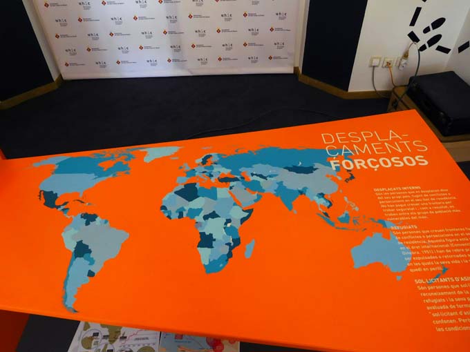 – 1 Taula amb un planisferi on es treballen a partir de mapes sobreposats els diferents conceptes associats a les persones refugiades (ex. refugiats interns, Païssos signats Convenció de Ginebra, païsso acollidors, localització de caps de Refugiats etc…).