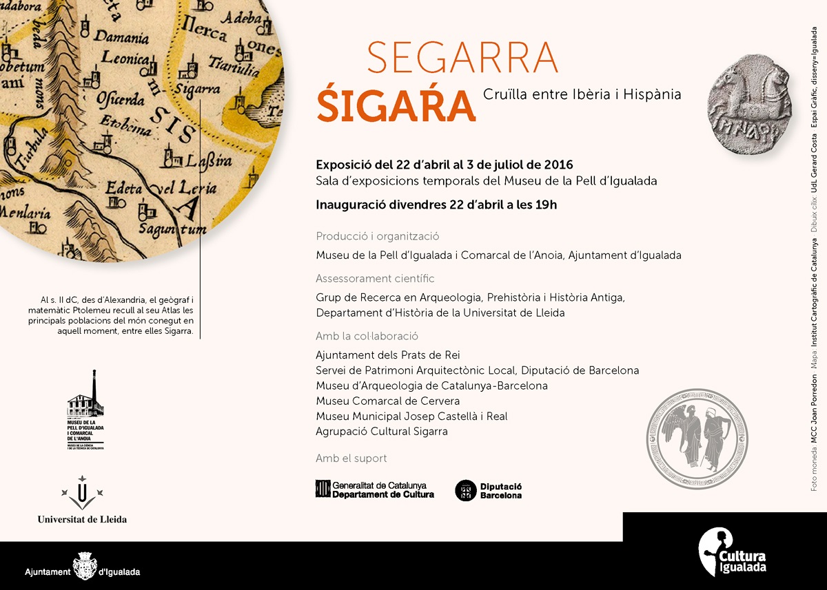 Ajuntament d’Igualada, UdL, Ajuntament dels Prats de Rei, Museu d’Arqueologia de Catalunya, Museu Comarcal de Cervera, Agrupació Cultural Sigarra, Diputació de Barcelona, Generalitat de Catalunya