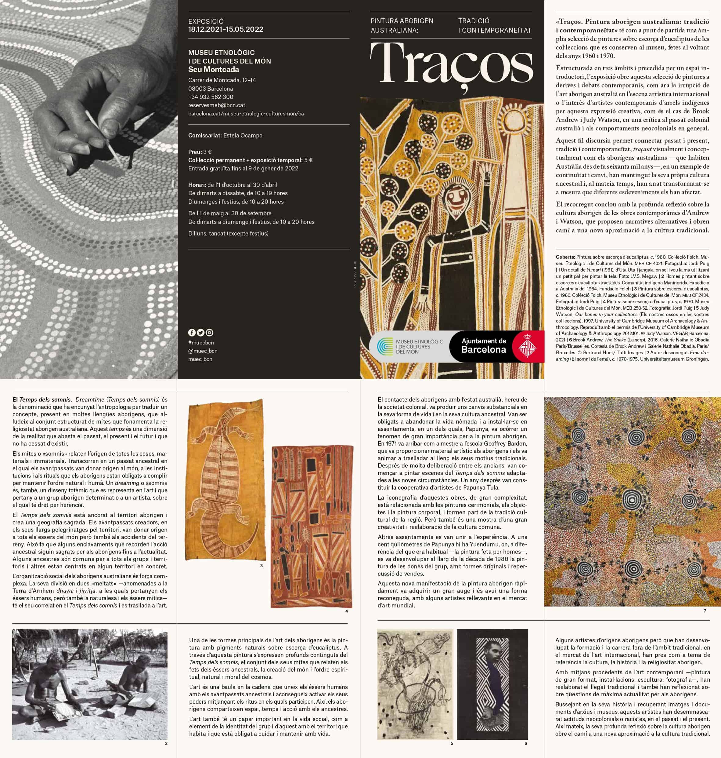 L’exposició, comissariada per Estela Ocampo, dona a conèixer una àmplia selecció de les inèdites col·leccions de pintura sobre escorça aborigen australiana dels anys 60 i 70 que es conserven al museu (pròpia i de la Fundació Folch), unes de les millors d’Europa. Estructurada en tres àmbits i precedida per un espai introductori, l’exposició obre aquesta selecció de pintures d’extremada riquesa estètica i fort transfons metafísic a derives i debats contemporanis, com ara la irrupció de l’art aborigen australià en l’escena artística internacional o l’interès d’artistes contemporanis d’arrels indígenes per aquesta expressió creativa, com és el cas de Brook Andrew i Judy Watson, en una crítica al passat colonial australià i als comportaments neocolonials en general.